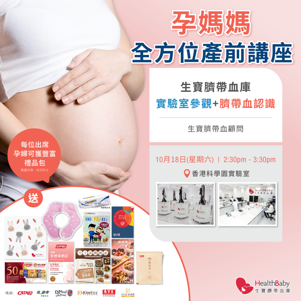 想在寶寶出生前準備一切,並為寶寶未來增添健康保障?快參加生寶舉辦的免費產前講座,了解臍帶血和臍帶膜的功用啦!臍帶血證實可協助醫治多種疾病,而且除了寶寶自身外,兄弟姊妹及父母亦有機會可以使用。儲存臍帶血是準父母於寶寶出世前需要考慮的重要事項之一,臍帶血講座費用全免,參加更有精美禮品,立即報名!