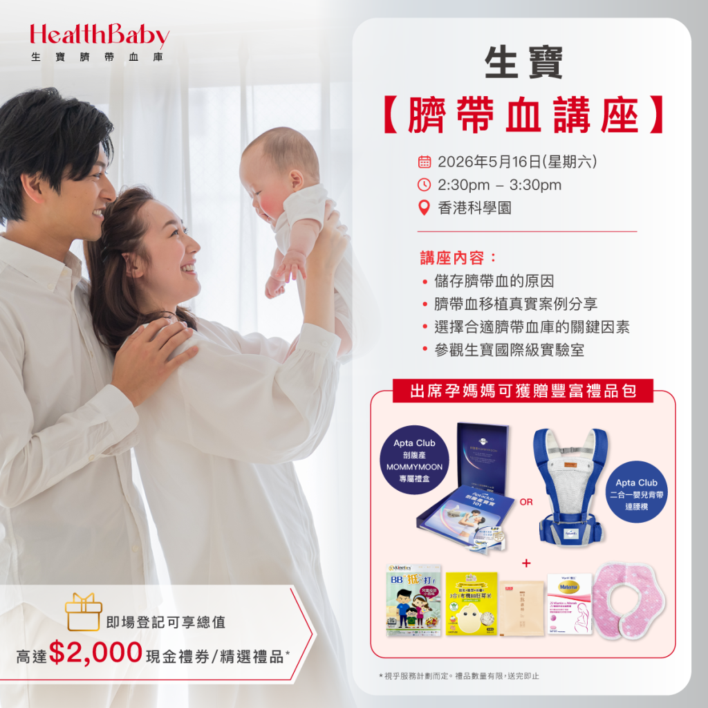 想在寶寶出生前準備一切,並為寶寶未來增添健康保障?臍帶血證實可協助醫治多種疾病,而且除了寶寶自身外,兄弟姊妹及父母亦有機會可以使用。儲存臍帶血是準父母於寶寶出世前需要考慮的重要事項之一,臍帶血講座費用全免,參加更有精美禮品,立即報名!
