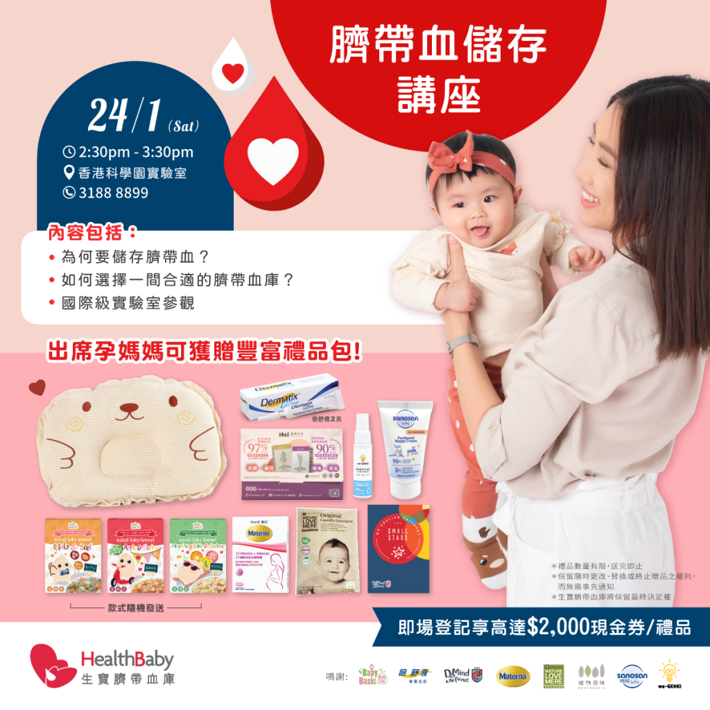 想在寶寶出生前準備一切,並為寶寶未來增添健康保障?快參加生寶舉辦的免費產前講座,了解臍帶血和臍帶膜的功用啦!臍帶血證實可協助醫治多種疾病,而且除了寶寶自身外,兄弟姊妹及父母亦有機會可以使用。儲存臍帶血是準父母於寶寶出世前需要考慮的重要事項之一,臍帶血講座費用全免,參加更有精美禮品,立即報名!