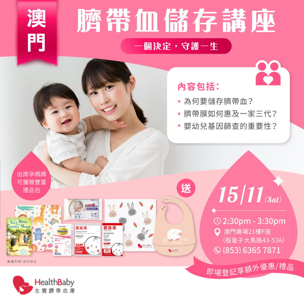 想在寶寶出生前準備一切,並為寶寶未來增添健康保障?快參加生寶舉辦的免費產前講座,了解臍帶血和臍帶膜的功用啦!臍帶血證實可協助醫治多種疾病,而且除了寶寶自身外,兄弟姊妹及父母亦有機會可以使用。儲存臍帶血是準父母於寶寶出世前需要考慮的重要事項之一。出席的孕媽媽將獲得精美母嬰禮品一份!