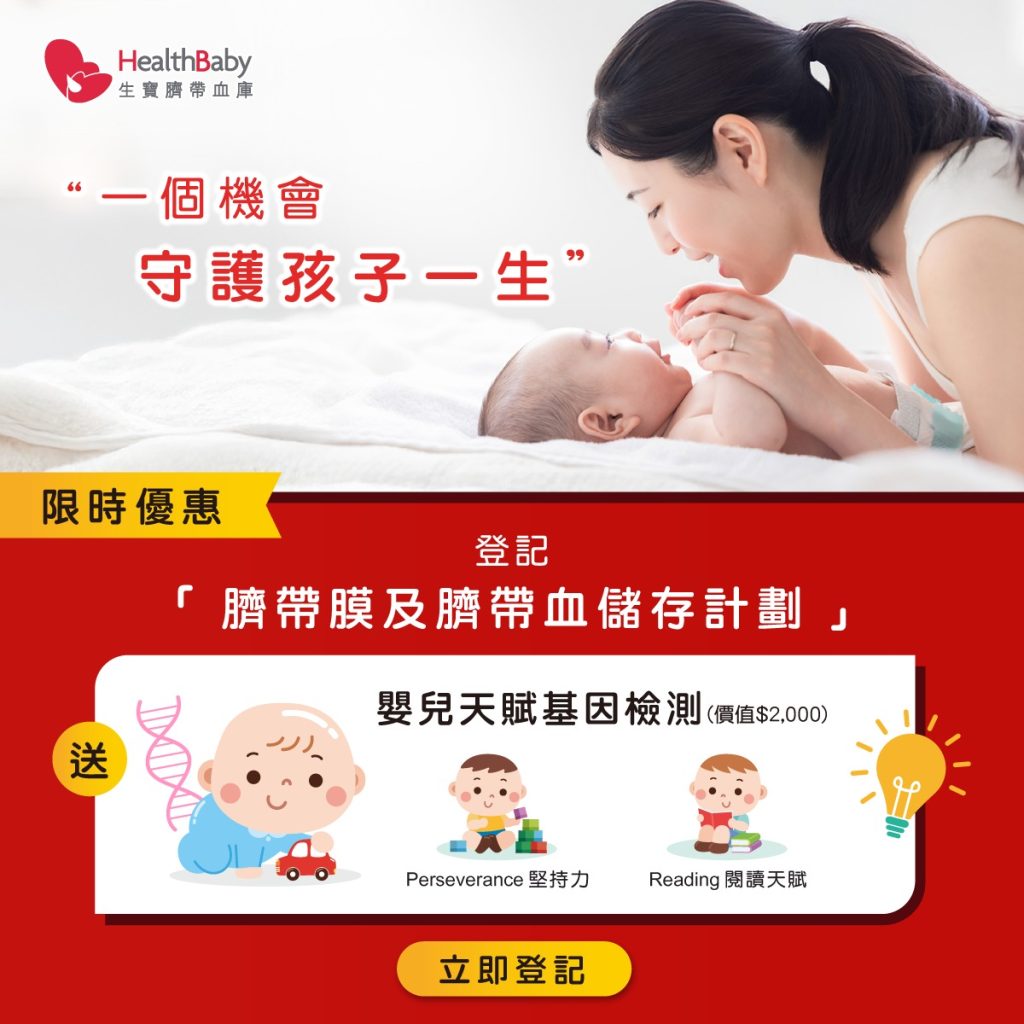 一生只有一次儲存臍帶血的機會,一份額外終身健康保障!臍帶血擁有珍貴的醫療價值,能協助治療多種疾病。寶寶及其兄弟姊妹和父母亦有機會用作治療,為家庭加添健康保障。